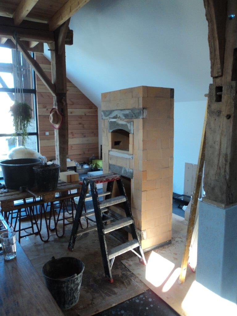 Een leemkachel wordt volledig ter plaatse opgebouwd en is echt maatwerk. De kachel bestaat uit een kern met verbrandingskamer en rookgaslabyrint die wordt ommanteld met leemstenen. Deze stenen fungeren als natuurlijke warmteaccu. De afwerking gebeurt met een leemstuc die zorgt voor een zachte en natuurlijke uitstraling.
